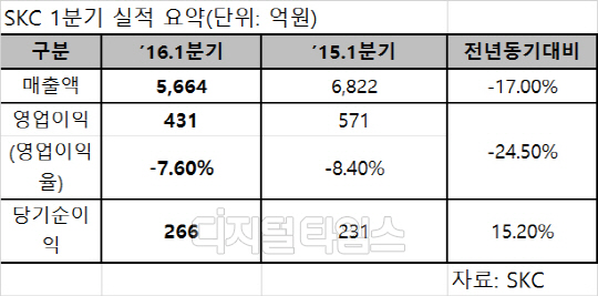 10일 SKC는 올해 1분기 5664억원, 영업이익 431억원을 기록했다고 공시했다. 지난해 같은 기간과 비교해 매출액은 17%, 영업이익은 24.5% 감소했다.
