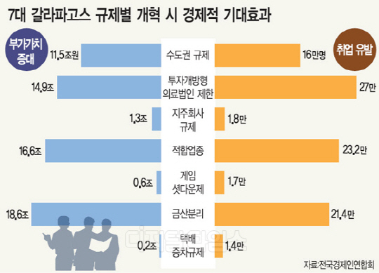 전국경제인연합회는 10일 △수도권 규제 △투자개방형 의료법인 제한 △지주회사 규제 △중소기업 적합업종 △게임셧다운제 △금산분리 △택배 증차규제 등 7개 항목에 대한 규제를 개혁할 경우 92만3000개 일자리와 63조5000억원의 경제적 효과를 창출할 수 있다고 밝혔다. 92만3000개의 일자리는 2014년 청년 실업자 수 38만5000명의 2.4배에 달하는 규모다.