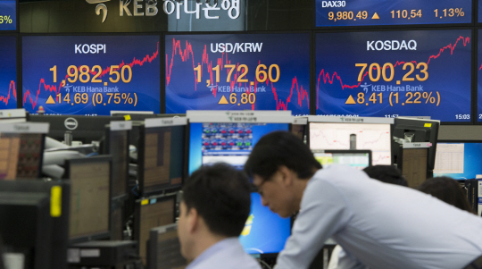 미 달러 대비 원화 환율이 6원 넘게 올랐다. 국제유가가 하락했고 미국의 지역 연방은행장이 '6월 기준금리 인상 가능성' 발언을 내놓은 것 등의 영향을 받았다. 10일 서울 외환시장에서 원달러 환율은 전날보다 6.8원 오른 1172.6원에 거래를 마쳤다. 코스피지수는 14.69포인트(0.75%) 상승한 1982.50에, 코스닥은 8.41포인트(1.22%) 상승한 700.23로 마감했다. 사진은 이날 서울 명동 KEB하나은행 딜링룸 모습.