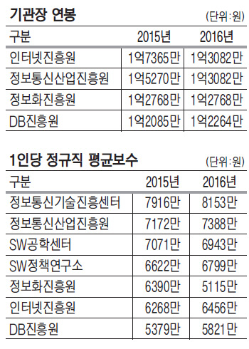 1인당 정규직의 평균보수액은 정보통신기술진흥센터가 7916만원으로 가장 높았다. 이 기관은 2014년 7332만원에서 작년 약 600만원이 증가했고 올해는 8153만원으로 늘었다. 이어 정보통신산업진흥원(7172만원), SW공학센터(7071만원), SW정책연구소(6622만원), 정보화진흥원(6390만원), 인터넷진흥원(6268만원), DB진흥원(5379만원) 순으로 집계됐다.
