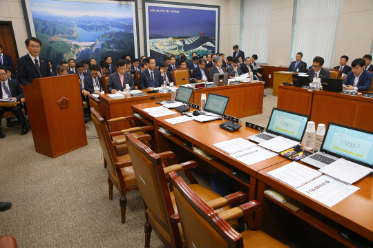 12일 오전 국회에서 열린 국토교통위원회 전체회의에서 강호인 국토교통부 장관이 현안보고를 하고 있다. 이날 보고시간에 출석하지 않은 의원들의 자리가 비어 있다.