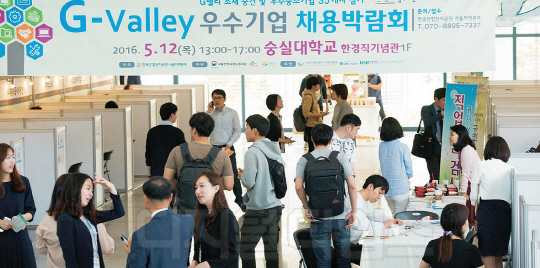 서울디지털단지 입주기업의 인력난 해소와 고용창출을 위한 캠퍼스 현장 채용마당인 '5월 찾아가는 G밸리 채용박람회'가 12일 서울 동작구 숭실대학교 한경직기념관에서 열렸다.