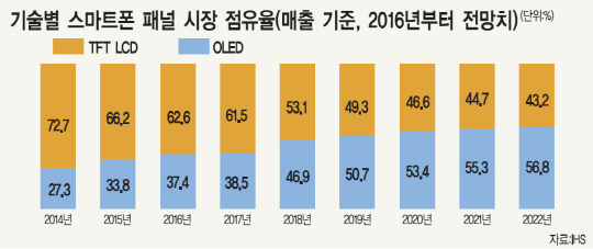 26일 시장조사기관 IHS와 디스플레이 업계에 따르면 지난해 106억달러였던 스마트폰용 OLED 패널 매출은 2019년 195억달러로 4년 만에 83% 성장해 전체 스마트폰 패널 시장의 50.7%에 이를 전망이다. 같은 기간 스마트폰용 LCD 패널 매출은 208억달러에서 190억달러로 줄어들어 점유율이 50% 아래로 떨어진다.