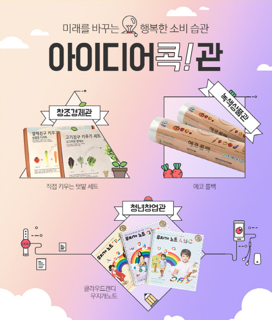 아이디어콕관은 아이디어나 품질은 좋지만 판로 확보가 어려운 중소기업 상품들을 모아 만든 온라인 전용관으로 청년창업기업 상품 35개와 창조경제 기업 상품 59개, 친환경 기업 상품 94개를 모아 188개 상품을 선보인다.