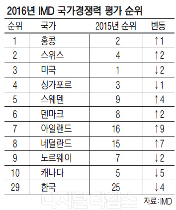 스위스 국제경영개발대학원(IMD)은 2016년 국가경쟁력 평가결과 한국의 종합순위는 평가대상 61개국 중 29위로 지난해 보다 4단계 하락했다고 31일 밝혔다.