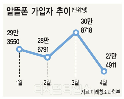 2일 미래창조과학부에 따르면, 지난 4월 월별 알뜰폰 가입자 수(신규가입+번호이동+기기변경)는 27만4911명으로 3월 30만8718명에 비해 3만3907명 줄어든 것으로 나타났다. 지난 1월 29만3550명과 2월 28만6791명과 비교해도 올해 들어 최저치다.