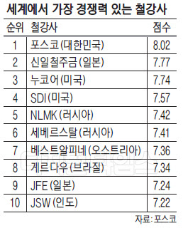 한편 엔저 영향으로 수출 경쟁력이 높아진 일본 신일철주금이 7.77점으로 2위를 기록했고, 셰일가스 사용으로 에너지비용 경쟁력을 높인 미국의 뉴코어(3위)와 SDI(4위)가 뒤를 이었다. 현대제철은 12위에 올랐다.