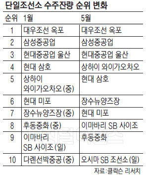 수주잔량 2위인 삼성중공업 거제조선소는 81척, 439만7000CGT로 일감이 전달보다 1.3% 줄었다. 4월에 이어 두 달째 3위인 현대중공업은 91척, 433만5000CGT로 전달보다 0.2% 감소했다.