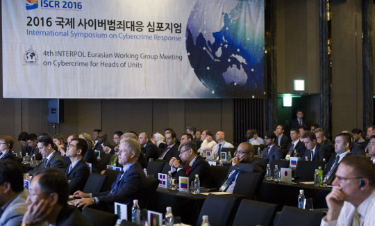 '2016 국제 사이버범죄 대응 심포지엄(ISCR 2016)'이 열린 15일 서울 종로구 JW매리어트 동대문스퀘어에서 국내외 참석자들이 정하웅 카이스트 교수의 특별강연을 듣고 있다. 국제 사이버범죄 대응 심포지엄은 전 세계 법집행기관과 국제기구, 국내외 사이버전문가가 함께 참여해 최신 정보를 공유하고 사이버 안전 강화 방안을 논의하는 자리이다.