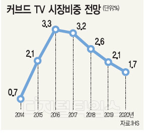 IHS는 2017년 3.2%, 2018년 2.6%, 2019년 2.1%, 2020년 1.7%로 해마다 시장에서 차지하는 비중이 낮아질 것으로 예상했다. 커브드 TV 판매량이 올해 740만대로 정점을 찍지만 2020년에는 427만대로 5년간 42%나 줄어든다는 설명이다.