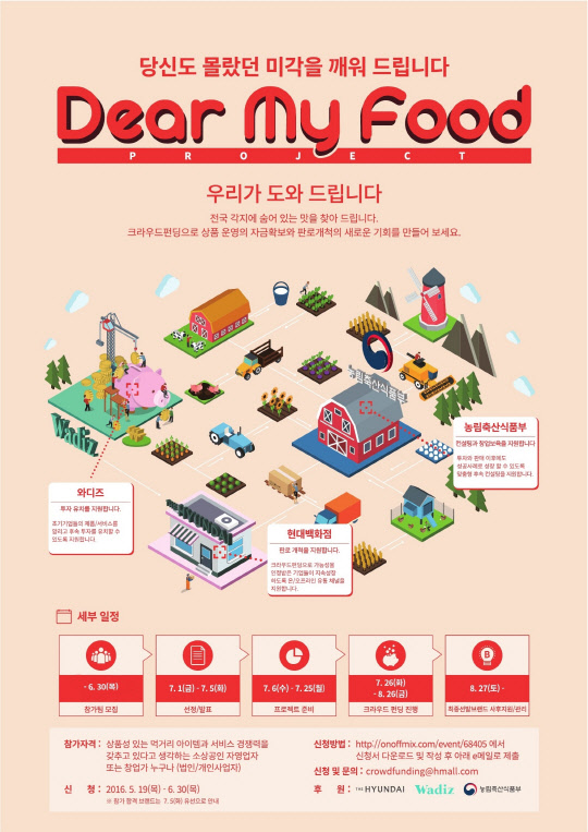 농림축산식품부에서는 아이디어 심사와 후속 지원 등을, 크라우딩 펀딩 전문기업 와디즈는 창업자금 유치, 브랜드 홍보 지원을 담당할 계획이다.