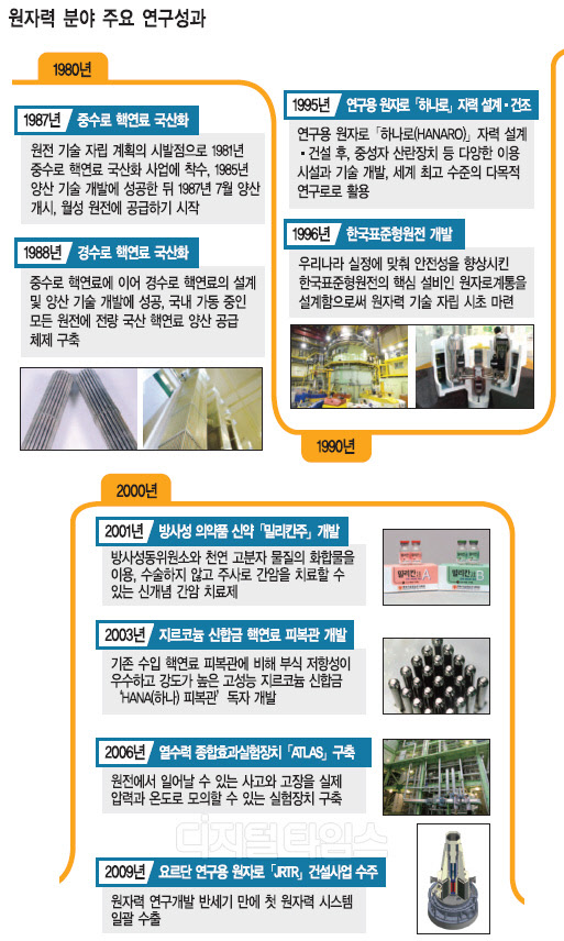 열출력 100㎾의 연구로 1호기가 가동한 데 이어 1972년엔 열출력 2㎿의 2호기(트리가 마크-쓰리)가 준공됐다. 연구용 원자로 1·2호기는 1995년까지 가동되면서 의료용 방사성 동위원소 생산과 중성자 연구, 원자력 인력 교육훈련 등에 다양하게 활용됐다. 이후 우리나라는 1995년 연구용 원자로 '하나로(HANARO)' 자력 설계와 건조, 2009년 사상 첫 원자력 시스템 일괄 수출로 기록된 '요르단 연구용 원자로(JRTR)' 건설 사업 수주 등의 성과를 거두며 연구용 원자로 기술 강국으로 발돋움했다.