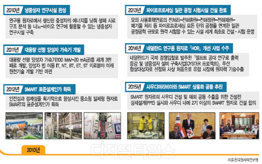 2012년에는 원자력연이 시작부터 우리 기술로 만든 100% '메이드 인 코리아' 원자로인 '스마트(SMART)' 원자로 개발에 성공했다. 15년의 개발 끝에 IAEA의 표준설계 인허가를 받은 SMART는 증기발생기와 가압기, 원자로냉각재 펌프 등 원자로 계통을 이루는 주요 기기들을 하나의 압력용기 안에 모두 설치한 세계 최초의 일체형 원자로다. SMART의 용량은 대형 원전 1기의 10분의 1 수준인 100㎿급으로, 국가 전체 전력망의 크기가 작아 대형 원전을 짓지 못하는 나라에 새로운 전력 대안으로 떠오르고 있다. 전력 생산뿐만 아니라 해수담수화, 지역난방, 공정열 공급 등 활용분야가 다양한 것도 강점이다.