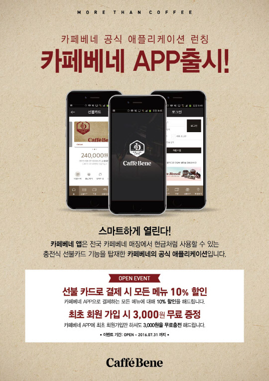 카페베네는 모바일 선불카드 앱 출시를 기념해 앱 회원 가입자 전원에게 3000원 상당의 선불카드를 자동 발급한다. 다음 달 말까지 카페베네 선불카드 앱을 통해 결제하면 카페베네 모든 메뉴에 대해 10% 할인 혜택을 받을 수 있다.