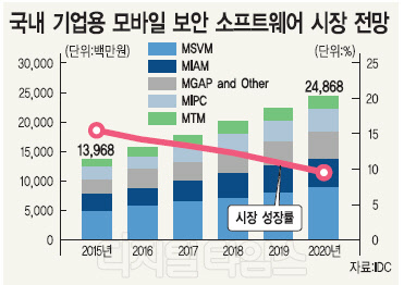 랜섬웨어가 모바일까지 진출하면서 보안 SW 시장이 커지고 있다. 시장조사업체 IDC에 따르면 지난해 국내 기업용 모바일 보안 SW 시장은 약 140억원 규모로 5년간 연평균 12.2%씩 성장했다. 오는 2020년에는 시장규모가 약 250억원에 달할 것으로 전망된다.