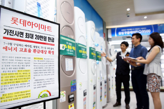 롯데하이마트는 지난 1일부터 가전 중 에너지소비효율 1등급 제품을 구매하는 고객에게 구매 금액의 최대 10%까지 환급해준다고 밝혔다. 사진은 롯데하이마트 대치점에서 고객들이 정부 환급 대상 제품을 살펴보고 있는 모습.