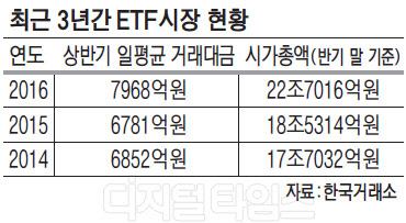 ETF 거래대금이 증가하자 코스피시장에서 차지하는 ETF 비중도 크게 늘어났다. 올해 상반기 코스피시장의 일평균 거래대금은 4조7914억원을 기록했다. 이중 ETF가 차지하는 비중은 16.5%로 지난해(12.55%)보다 4%포인트 가량 늘어났다.