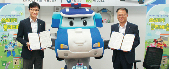 신진수 환경부 자원순환국장(오른쪽)이 4일 서울 강남구 로이비쥬얼 본사에서 이동우 로이비쥬얼 대표와 로보카폴리 자원순환 홍보대사 위촉에 관한 업무 협약을 체결한 후 어린이 인기 애니메이션 캐릭터 폴리와 함께 기념촬영 하고있다.