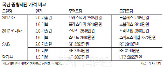 SM6·말리부에 밀려 판매 4위 중형시장 '양강' 탈환 대반격 2017년형 K5·스페셜 트림 출시 제품군 다변화·가격조정 단행 하이브리드모델 특별 지원금도