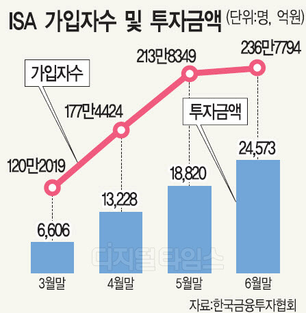 금융위는 3월 14일 ISA 제도를 시행한 이후 활성화 후속 조치로 4월 18일 지점 방문 없이도 일임형ISA 가입이 가능하도록 했고, 지난달 30일부터는 일임형ISA 수익률 공개 제도를 시행했다. 그럼에도 가입자 증가세는 계속 둔화되고 있다. 금융투자협회에 따르면 ISA 전체 가입자 수는 4월 말 177만4424명으로 3월 말(120만2019명) 대비 48% 증가했던 것이 5월 말(213만8349명)에는 21%, 6월 말(236만7794명) 11% 증가하는데 그쳤다. 가입 금액은 6월 말 기준 2조4573억원이다. 이 역시 지난 4월 출시 한 달 만에 1조원을 돌파한 뒤 두 달 반 동안 1조5000억원 증가하는 데 그쳤다.