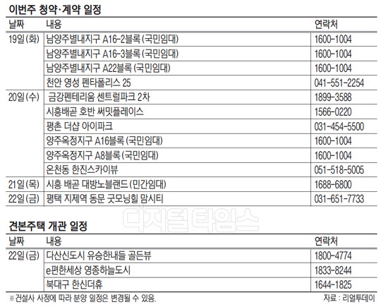 이번 주에는 전국 분양 시장에서 청약접수 12곳을 비롯해 견본주택 3곳, 당첨자 발표 13곳, 계약 18곳이 예정돼 있다.