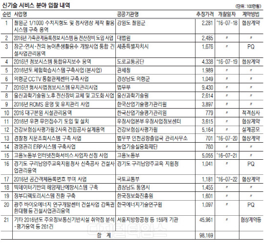 조달청은 이번 한 주 동안 법무부의 '2016년 형사사법정보시스템 유지관리사업' 등 281건, 981억원 상당의 신기술·서비스 분야 물품 및 용역 입찰을 집행한다. 분야별로는 △도로교통공단의 '2016년 정보시스템 통합유지보수용역' 등 142건, 679억원 규모의 정보화사업 △한국산업기술평가관리원 대구 본원 시설관리용역 등 119건, 168억원 규모의 일반용역 사업 △건강보험심사평가원 2사옥 건립공사 설계용역 등 20건, 134억원 규모의 건설용역사업이 각각 진행된다. 법무부의 '2016년 형사사법정보시스템 유지관리사업'은 94억3000만원 규모로, 협상에 의한 계약방식으로 19일 개찰한다. 또 도로교통공단의 '2016년 정보시스템 통합유지보수 용역'과 한국산업기술평가관리원의 '2016년 RCMS 운영 및 유지관리사업은 각각 43억3800만원, 38억9700만원 규모로 협상계약으로 진행된다.이 가운데 정보화사업은 80억원 이상 1건을 제외한 141건이 대기업의 입찰참가자격 제한입찰 또는 중소기업간 경쟁 입찰로 이뤄져 전체 금액의 86.1%인 585억원 상당을 중소기업이 수주할 것으로 전망된다.