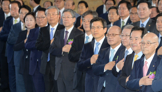 정세균 국회의장과 황교안 국무총리를 비롯한 참석자들이 17일 국회에서 열린 제68주년 제헌절 기념식에서 국기에 대한 경례를 하고 있다.