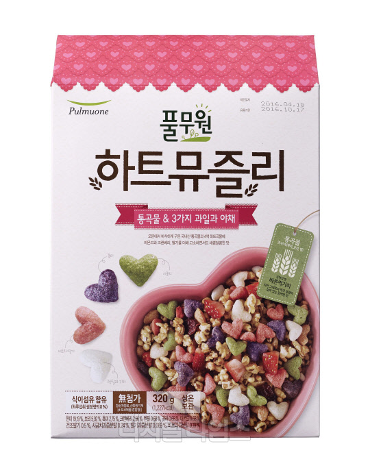 풀무원식품(대표 이효율)이 국내산 통곡물 뮤즐리에 하트 모양 곡물을 추가한 '하트뮤즐리'(사진)를 출시했다.