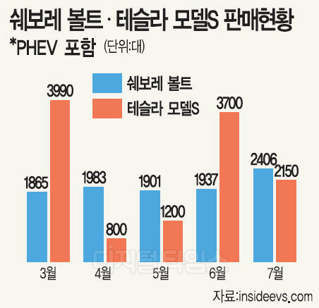 볼트(Volt)는 연간 누적 판매량(7월 말까지)에서도 1만2214대를 기록, 모델S(1만4240대)를 200여대 차이로 맹추격하고 있다. 최근에는 친환경차 모델 중 처음으로 미국 누적 판매량 10만대를 돌파하는 기록도 세웠다.