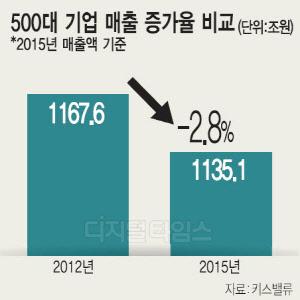 7일 전국경제인연합회가 기업 매출 감소와 법인세수(稅收) 증가 원인을 비교· 분석한 자료에 따르면 2011년 이후 21분기 동안 1% 넘은 경제성장률을 이룩한 분기는 단 2번에 불과했고, 글로벌 경기 둔화와 내수 위축 등으로 500대 기업의 매출액이 갈수록 줄어들고 있다. 전경련이 한국상장회사협의회 등의 자료를 분석한 결과, 500대 기업의 매출은 2012년 1167조6000억 원에서 지난해에 1135조1000억 원으로 3년 간 2.8% 감소했다. 기업이 매출 감소 등 성장성 하락을 만회하기 위해 설비 축소나 고용 감축 등 '마른 수건 쥐어짜기' 경영을 하면서 이 기간 중 당기순이익 증가율은 6.1%를 기록했다. 상장기업 및 일부비상장기업 2124개 가운데서도 연간 매출액이 감소하는 기업이 2010년 22.5%에서 지난해 45.7%로 두 배 이상 수준으로 증가했다.