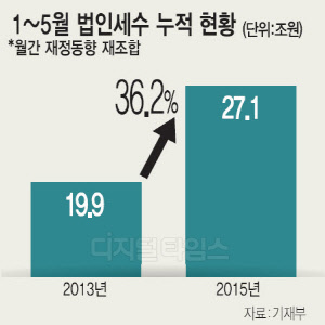 기업들이 체질적 저성장을 이겨내기 위해 몸부림을 치고 있지만, 세수는 크게 늘어났다. 올 1분기에 경제성장률은 0.5%에 그쳤지만, 국세청의 국회 기획재정위원회 업무보고 자료에 따르면 올 들어 5월까지 걷힌 법인 세수는 27조1000억원으로 전년 동기 대비 25.5% 급증했다. 이는 다른 세수(소득세수 22.8% 증가)와 비교해도 높은 증가율이다. 2013년 대비 올해 5월까지 누적 법인 세수는 36.2%나 급증한 것으로 집계됐다. 기업들이 매출을 불리는 확대경영을 해서 법인세를 많이 낸 것이 아니라 투자와 고용을 줄이는 축소 경영을 하는 와중에 예상보다 많은 세금을 낸 것이라는 분석이다. 김광림 새누리당 정책위의장이 지난 4일 "흉년에는 세금을 낮추고 풍년에는 세금을 올리는 것이 치국의 기본"이라고 말한 것도 같은 맥락이다. 전경련은 법인 세수가 급증한 것은 법인세 공제· 감면 축소, 기업소득환류세제 시행 등 기업들에 대한 사실상의 증세 조치가 이뤄졌기 때문이라고 진단했다.