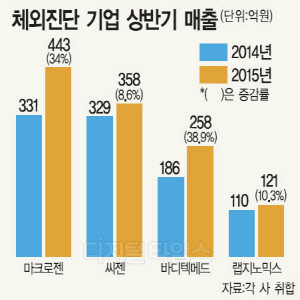 최재훈 한국투자증권 연구원은 "세계 체외진단 시장 규모는 2014년 522억달러로 2019년까지 연평균 7.3% 증가할 전망"이라며 "국내 업체들은 글로벌 업체와 비슷한 품질에 더 낮은 가격으로 시장 점유율을 높이고 있다"고 설명했다.
