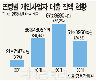 대출 잔액을 연령대로 분류하면 50대의 대출 잔액은 97조9691억원으로 전체의 39.2%를 차지했다. 특히 50세 이상 은퇴 연령층의 대출 잔액은 전체 대출잔액의 63.7%를 차지하는 것으로 집계됐다.