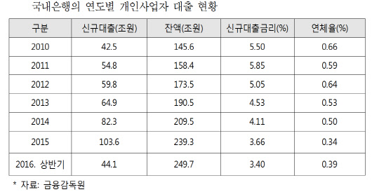 또한 개인사업자 신규대출의 평균금리는 같은 기간 3.52%에서 3.40%로 0.12%p 하락하는데 그쳤다. 대출 잔액은 급증하는데 금리인하 폭은 매우 작아 은행의 이자수익은 같은 기간 11조2327억원에서 11조8524억원으로 6197억원(5.5%) 늘어났다.