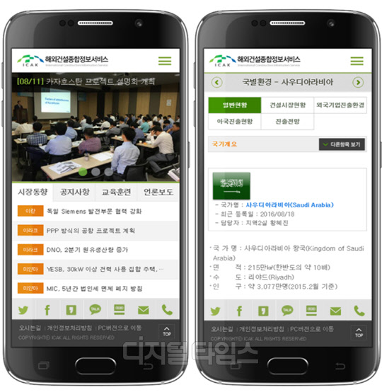 해외건설협회는 해외건설 정보를 모바일 기기로 볼 수 있는 모바일 종합정보서비스(사진)를 개발했다고 24일 밝혔다. 나라별 환경, 시장동향, 건설통계, 진출 안내, 발주정보 등 협회가 생산 수집하는 관련 정보가 PC 환경과 같게 제공된다. 웹 표준기술(HTML5)을 활용해 페이스북, 카카오톡과 같은 소셜미디어와도 쉽게 연결돼 다른 사람들과 정보를 공유하기도 편리하다.