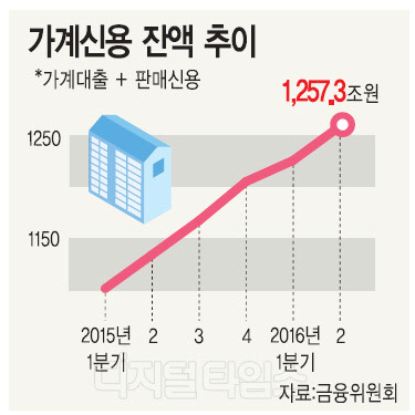한국은행(이하 한은)이 25일 발표한 '2016년 2분기중 가계신용(잠정)'에 따르면 올 4~6월 말 현재 가계신용 잔액은 1257조3000억원으로 집계됐다. 이는 한은이 해당 통계를 작성하기 시작한 2002년 4분기 이래 잔액기준으로 최대 규모다.