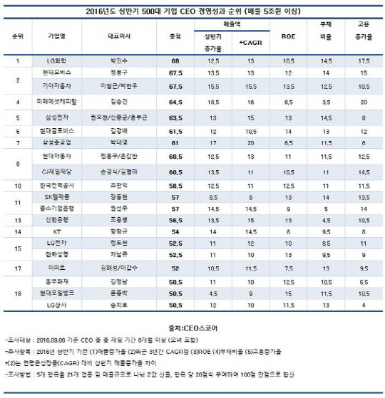 CEO 경영성적은 사업 기간이 3년 이상인 기업에서 6개월 이상 재임한 CEO 363명(268개사)을 대상으로 작년 상반기와 비교한 매출액 증가율, 최근 3년간 연평균 매출성장률(CAGR)과 비교한 상반기 초과 성장률 차이, 자기자본이익률(ROE), 부채비율, 고용증가율 등 5개 항목별로 20점씩 부여해 평가했다.