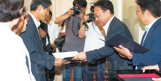 유일호 경제부총리 겸 기획재정부 장관이 7일 서울 종로구 정부서울청사 별관에서 열린 제20차 재정전략협의회를 주재하기 앞서 민간위원들에게 위촉장을 수여하고 있다.