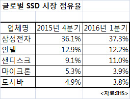 11일 시장조사기관 IHS에 따르면 삼성전자는 올해 1분기에 SSD 시장 점유율(매출기준) 37.3%를 기록했다. 이는 전 분기(36.1%)보다 1.2%포인트, 작년 동기(32.8%)보다 4.5%포인트 각각 올라간 수치다.
