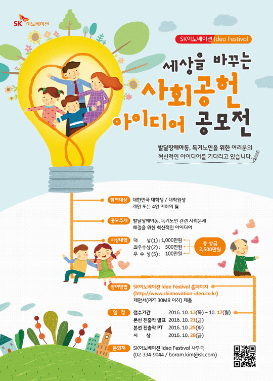 대학생과 대학원생이 대상이고, 개인 또는 4인 이하의 팀으로 이 행사에 참여할 수 있다. 참가 접수는 다음 달 13일부터 17일까지 홈페이지(www.skinnovation-idea.co.kr)에서 받는다. SK이노베이션은 서류심사와 경쟁 프레젠테이션, 네티즌 심사 등을 거쳐 총 8개 아이디어를 선발할 예정이고, 최종 수상작에는 대상 1팀 1000만원, 최우수상 2팀 각 500만원, 우수상 5팀 각 100만원 등 총 2500만원의 상금을 준다.
