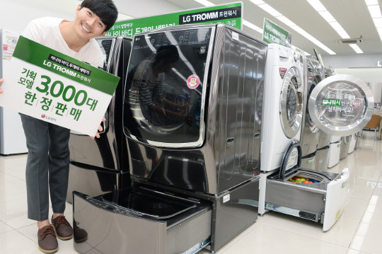LG전자는 3000대만 한정판매하는 100만원대 트윈워시 기획모델을 출시했다고 26일 밝혔다. 이번 트윈워시 기획모델(모델명 F17WDAC)은 상단의 세탁용량 17㎏ 드럼세탁기와 하단의 세탁용량 3.5㎏ 미니워시가 결합한 제품이다. 가격은 기존과 동일한 용량의 트윈워시와 비교해 약 100만원이 낮은 155만원이다. 이날 서울 염창동에 위치한 LG 베스트샵 강서본점 매장에서 모델이 트윈워시 주요 제품을 소개하고 있다. LG전자 제공