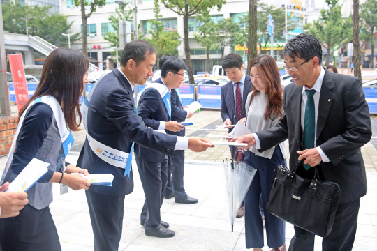 NH농협생명이 28일 '부정청탁금지법'(김영란법) 시행을 맞아 임직원 청렴문화 확산 캠페인을 전개했다. 이날 NH농협생명 청렴 프런티어단 13명은 오전 8시부터 9시까지 서대문 본사 앞에서 출근하는 임직원들에게 청탁금지법 안내자료를 나눠주며 공정한 업무수행과 청렴한 조직문화의 실천을 당부했다. 청렴 프런티어단은 지난 7월 21일 청렴한 조직문화 정착을 위한 선도적 실천과 홍보대사 역할의 수행을 위해 선발한 직원들이다.