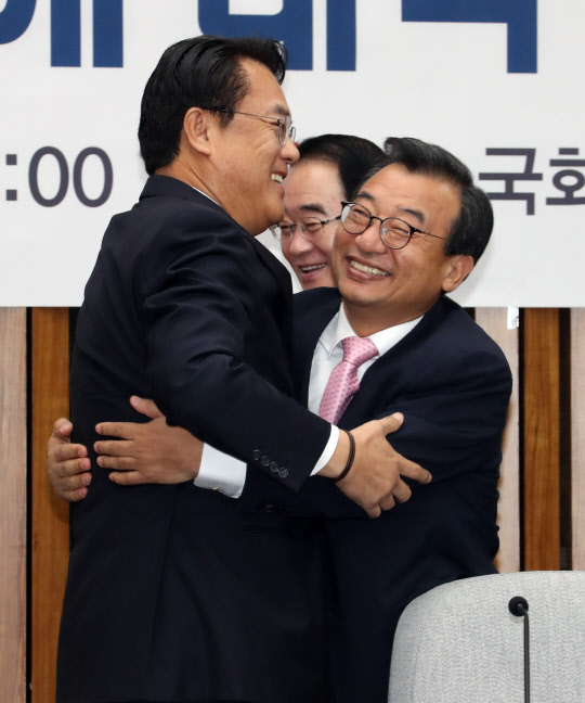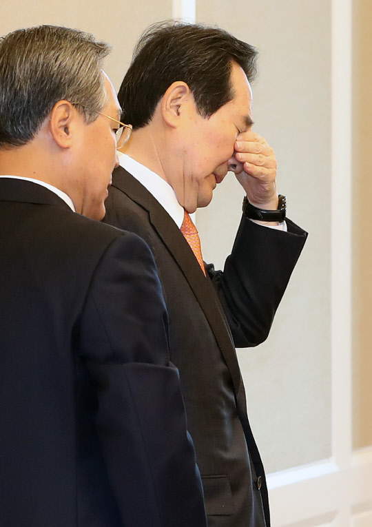 국회 파행사태 이후 해외순방에 나섰다 전날 귀국한 정세균 국회의장이 10일 국회에서 열린 한 모임에 참석하며 피곤한 듯 코를 만지고 있다. 이날 이정현 새누리당 대표(오른쪽)도 1주일간의 단식 농성을 끝낸 뒤 9일까지 전국 각지를 돌며 민생현장 강행군을 마친 뒤 국회에 복귀했다.