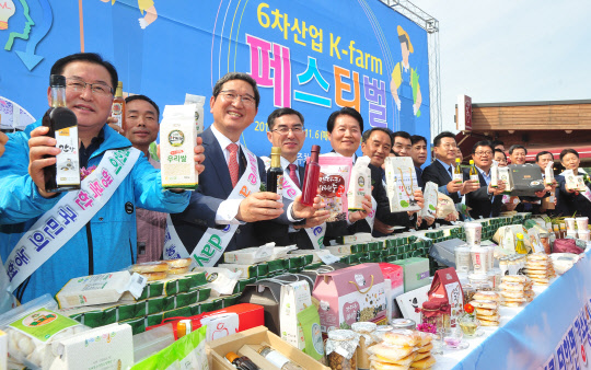 김병원 농협중앙회장(왼쪽 다섯번째)이 지난 15일 경기도 안성시 공도읍 안성팜랜드 광장에서 개최된 '농업에 파란을 일으켜라! 6차산업 케이-팜(K-farm) 페스티벌' 개장식에서 관계자들과 우리 농산물로 만든 6차산업화 제품과 쌀 등을 선보이고 있다. 이번 행사는 11월 6일까지 안성팜랜드 광장에서 매주 토, 일요일 운영할 계획이다. 왼쪽 세번째부터 김학용 의원, 이준원 농식품부 차관, 김 회장, 황은성 안성시장.