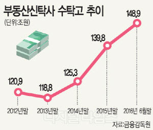 부동산 신탁사들은 최근 수주 호황으로 3∼4년간 지속 성장할 것으로 전망된다. 올해 수주액은 1조원을 넘어설 것으로 예상된다. 지난해 전체 수주액 8600억원을 웃도는 수치다. 실적이 늘어난 것은 차입형 토지신탁 수주가 증가했기 때문으로 풀이된다. 차입형 토지신탁은 시행사가 부동산신탁사에 토지를 맡기고 개발자금을 빌려 쓰는 신탁상품으로, 은행의 부동산 프로젝트파이낸싱(PF) 대출과 성격이 비슷하다. 지난 6월 말 기준으로 전체 부동산신탁사의 수탁고 148조9000억원 차입형 토지신탁은 8000억원으로 20.4% 증가했다. 차입형 토지신탁 보수가 영업수익에서 차지하는 비중도 매년 늘고 있다. 2012년 19.9%에서 올해 상반기 32.3%까지 확대됐다.