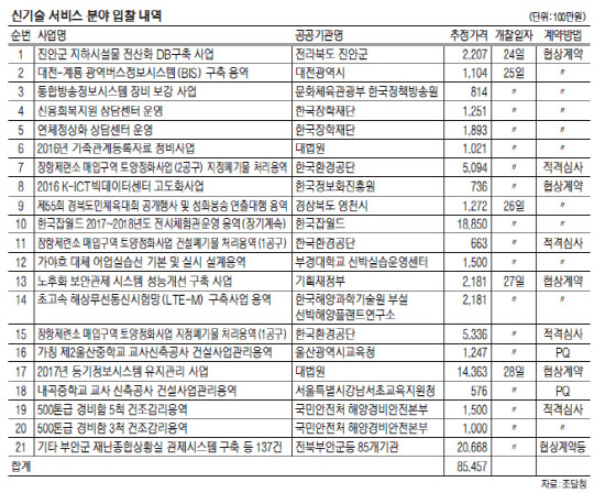 분야별로는 △전북 진안군의 '지하시설물 전산화 DB구축사업' 등 77건, 355억원 규모의 정보화 사업 △한국잡월드 2017∼2018년도 전시체험관 운영용역 등 68건, 425억원 규모의 일반용역 사업 △제2울산중학교(가칭) 교사 신축공사 건설사업 관리용역 등 12건, 74억원 규모의 건설용역 사업이 각각 진행된다. 기획재정부의 '노후화 보안관제시스템 성능개선 구축사업'은 21억8100만원 규모로 협상에 의한 계약방식으로 27일 개찰한다. 전북 진안군의 '지하시설물 전산화 DB구축사업'과, 선박해양플랜트연구소의 '초고속 해상무선통신시험망(LTE-M) 구축사업 용역'도 각각 22억700만원, 21억8100만원 규모로 협상계약으로 진행된다.이 가운데 정보화사업은 80억원 이상 1건을 제외한 76건이 대기업의 입찰참가자격 제한입찰 또는 중소기업간 경쟁 입찰로 이뤄져 전체 금액의 212억원(59.7%) 상당을 중소기업이 수주할 것으로 전망된다. 일반용역은 10억원 이상 4건을 제외한 64건이 중소기업간 경쟁입찰 또는 10억원 미만 사업으로 전체 금액의 26.1%인 111억원 상당을 중소기업이 수주할 것으로 예상된다.