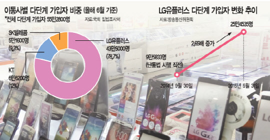 국회 입법조사처에 따르면, 올해 6월 기준 다단계를 통해 이동통신에 가입한 이용자 수는 55만2800명입니다. 구체적으로 LG유플러스가 43만5000명으로 전체의 78.7%로 가장 많고 KT 6만6200명, SK텔레콤 5만1600명 순입니다. 아무래도 3위 사업자인 LG유플러스가 가장 적극적으로 다단계를 이용해 가입자를 모으는 모습입니다. 실제 단통법 시행 전인 2014년 9월 30일 기준 LG유플러스의 다단계 가입자는 9만5833명이었으나, 단통법 후 지난해 5월말까지 약 2.65배 증가했습니다. 지난해 말부터 올해 6월까지 6개월 동안만 살펴봐도 LG유플러스 전체 LTE 가입자가 5.4% 증가하는 동안, LG유플러스 다단계 유통점의 가입자는 무려 32.1% 늘었습니다.