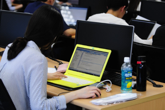 롯데정보통신은 다음달 1일부터 14일까지 IT 직무 역량만으로 인재를 선발하는 '스펙태클' 채용을 실시한다고 24일 밝혔다. 입사 지원자는 스펙을 기재하지 않고 '클라우드 기반 모바일 예약, 결제시스템 개발'을 주제로 직접 프로그램을 제작해 제출하면 된다. 작년 스펙태클 오디션 참가자가 프로그램을 만들고 있다. 롯데정보통신 제공