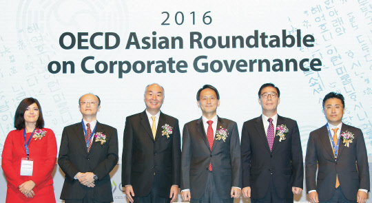 이창재 법무부 차관(오른쪽 세번째)이 24일 오전 서울 용산구 그랜드하얏트호텔에서 개최된 'OECD 기업지배구조 아시아 라운드테이블'에서 참석자들과 기념촬영하고 있다.