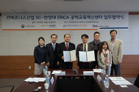 IT Biz SC와 한양대학교 에리카(ERICA) 공학교육혁신센터는 경기 안산시 한양대 제3 공학관에서 양해각서(MOU)체결했다고 26일 밝혔다. 김효정 IT Biz SC팀장(왼쪽부터), 최재인 사업부장, 이재근 상근부회장, 노삼영 한양대 ERICA 공학교육혁신센터장, 김병철 부장, 김수민 연구원, 김승희 책임이 기념촬영을 하고 있다.